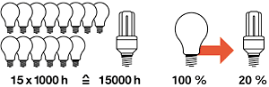 Чем же хороши компактные люминесцентные лампы по сравнению с обычными лампами накаливания? Во-первых, при их работе электроэнергии тратится в 5 раз меньше, чем при работе обычных ламп. Еще один плюс: если средний срок службы обычной лампы накаливания - 1000 часов, то у компактной люминесцентной лампы он составляет 15000 часов!