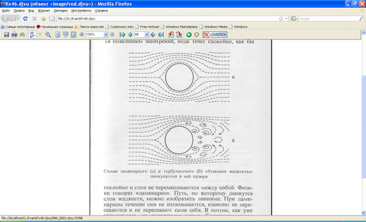 «Медленным» будем называть такое движение пузырька, при котором перетекание воды от его лобовой к тыльной поверхности не сопровождается появлением завихрений, вода течет спокойно, как бы послойно и слои не перемешиваются между собой. Физики говорят «ламинарно». Путь, по которому движутся слои жидкости можно изобразить линиями (см рис 1. а). При ламинарном течении они не изламываются, взаимно не пересекаются и не пересекают сами себя. В потоке не появляются вихри. Соприкасающиеся слои жидкости получают информацию друг о друге вследствие их взаимного трения. При таком обтекании пузырька жидкостью установившаяся скорость его ламинарного всплывания