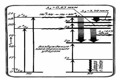 Этот процесс, имеющий резонансный характер, приводит к селективному заселению тех состояний атомов Ne, энергия которых наиболее близка к энергии уровней