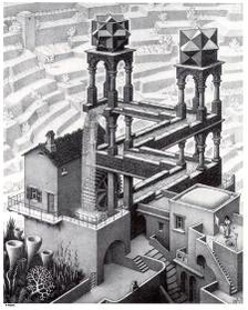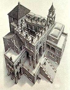 Невозможная лестница была первым невозможным объектом, который использовал Эшер в своём творчестве. В реальности не существует лестницы, по которой можно одниматься, спускаясь, как в его литографии «Восхождение и спуск» . Прямоугольник внутреннего двора замкнут стенами здания, у которого вместо крыши – бесконечная лестница по которой идут на встречу друг другу люди…