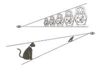 Выстроим, друг за другом по росту несколько матрешек, и посмотрим на них со стороны самой маленькой фигурки, а затем начнём медленно отходить назад, не изменяя при этом направления взгляда, то можно наблюдать, как матрешки будут постепенно «сливаться», загораживая друг друга. Наконец, на некотором расстоянии будет видна только одна из них - та, что расположена ближе остальных. Сместим фигурки в горизонтальных плоскостях, перпендикулярных направлению взгляда, таким образом, чтобы все они были полностью видны - матрешки кажутся одного размера.