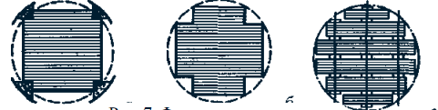 Форма поперечного сечения стержней зависит от мощности трансформатора: в небольших трансформаторах применяют стержни прямоугольного сечения (рис.7, а), в трансформаторах средней и большой мощности — стержни ступенчатого сечения (рис.7, б, в) с числом ступеней, возрастающим с увеличением мощности трансформатора. Ступенчатое сечение стержней обеспечивает лучшее использование площади внутри обмотки, так как периметр ступенчатого стержня приближается к окружности. В трансформаторах большой мощности для улучшения теплоотдачи между пакетами стали магнитопровода устраивают вентиляционные каналы (рис.7, в).