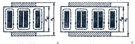 Возможны два варианта взаимного расположения обмоток на стержнях магнитопроводов: раздельное расположение (на одном стержне обмотка ВН, а на другом применяют весьма редко и только в высоковольтных трансформаторах, так как это создает лучшие условия для надежной изоляции обмотки ВН от обмотки НН; однако в этом случае наблюдается увеличение магнитного потока рассеяния; наиболее распространено равномерное концентрическое расположение обмоток на всех стержнях магнитопровода (см. рис.2,а), так как это обеспечивает малую величину магнитного потока рассеяния. При этом обычно ближе к стержню располагают обмотку НН, так как она требует меньшей электрической изоляции от стержня (заземленного), затем укладывают слой изоляции из картона или бумаги и обмотку ВН.