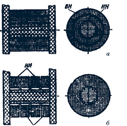 Обмотки бывают цилиндрические, располагаемые на стержнях, концентрические (рис.8, а) и дисковые, располагаемые на стержнях в чередующемся порядке (рис.8, б).