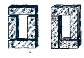 Магнитопровод трансформатора выполняют из листовой электротехнической стали. Перед сборкой листы с двух сторон изолируют лаком. Такая конструкция магнитопровода дает возможность в значительной степени ослабить в нем вихревые токи. Часть магнитопровода, на которой располагают обмотки, называют стержнем.