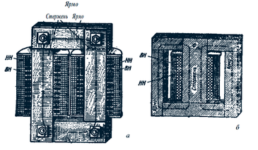 В стержневых трансформаторах имеются два стержня и соединяющих их два ярма (рис.2, а). Броневые трансформаторы имеют разветвленный магнитопровод с одним стержнем и ярмами, частично прикрывающими ("бронирующими") обмотки (рис.2, б).