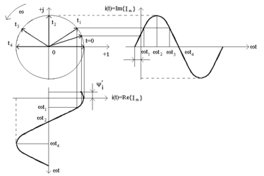 бачимо, що синусоїдна функцiя i (t) може розглядатися як уявна частина (2) або як проекцiя вектора