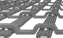 На рисунке 3 схематически показаны параллельные плоские полоски нанопроводников, состоящие из нескольких атомарных слоёв. Эти полоски пересекает под прямым углом, не касаясь, ряд параллельных нанопроводников, имеющих форму мостов. При этом с верхних проводников на нижние спускаются молекулярные цепочки, сформированные из полупроводникового материала. Построенные по этой технологии схемы уже продемонстрировали способность хранить информацию и выполнять логические операции, то есть - заменять транзисторы.