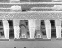 Увеличено в 50 000 раз. Размер по горизонтали равен 4 мкм. Транзисторы образованы кристаллами кремния (голубыми столбиками). Зелёный слой – окись кремния.