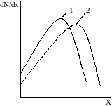 Рисунок 9.2 – Характерные функции распределения плотности имплантированных атомов по толщине слоя: 1-при энергии ионов Е1; 2 –при энергии ионов Е2