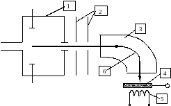 Рисунок 9.4 – Принципиальная схема установки для ионной имплантации: 1–камера ионизации; 2–ускоряющие и фокусирующие линзы; 3–система сепарации ионов; 4–мишень; 5–система нагрева мишени; 6–поток ионов