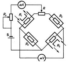 Резистори R2 і R4 частіш за все містяться у камерах, заповнених повітрям, а резистори Rl і R3 — у камерах, крізь котрі проходить газова суміш, що підлягає аналізові. Міст живиться від джерела Б через регульований резистор Rр, за допомогою якого заздалегідь встановлюють певну величину струму живлення, контрольовану міліамперметром. Реохорд R у цій схемі забезпечує можливість встановлення нульового показання мілівольтметра — покажчика напруги розбалансування мосту до початку вимірювань, коли камери резисторів R1 і R3 заповнюють повітрям, як і камери резисторів R2 і R4.