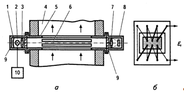 Дим, що проходить уздовж димоходу завдяки наявності широких прорізів 6, вільно заходить у трубу 5 і поглинає частину світла, що несе промінь від лампи 2, Завдяки цьому величина світлового потоку, що досягає термобатареї 8, буде дещо зменшеною, а це призведе до зменшення ЕРС термобатареї Ет і показань вольтметра чи потенціометра, які встановлені на щиті керування топками. Показання цих приладів функціонально залежатимуть від вмісту твердих часток у димових газах. Чим більшою буде напруга термобатареї, тим прозоріші димові гази, а значить ефективніше використовуватиметься паливо, що надходить у топку. Термобатарея, складена з шести термопар, що з'єднані послідовно, зображена на рис. 1, б. Всі кінці термопар, що підлягають опромінюванню, мають надійний тепловий контакт (але не електричний), з зачорненою металевою платівкою, розміщеною в скляному балоні, крізь стінку якого зібраний об'єктивом 7 промінь нагріває її разом з кінцями термопар. Внутрішній об'єм труби 5 повинен бути надійно відділений склом 9 від об'ємів, у яких розміщено освітлювальну лампу 2 з конденсором 3 та об'єктив 7 з термобатареєю 8.