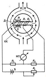 Завдяки наявності безперервного потоку газової суміші, ще холодної у лівій частині діаметральної трубки, платиновий резистор R1 охолоджується дещо більше, ніж розташований далі по потоку резистор R2, повз який проходить вже підігріта суміш. Через різницю температури резисторів R1 і R2 величини їх опорів будуть дещо відмінними, що призводить до розбалансування мосту, створеного резисторами Rl, R2, R3, R4 і до появи відхилення покажчиками магнітоелектричного мілівольтметра МП. І це відхилення буде тим більшим, чим більшим буде вміст кисню у газовій суміші. Регульований резистор Rp призначений для початкового встановлення напруги на мості.