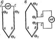 Можно разомкнуть контур в месте контактирования термоэлектродов А и В и вставить дополнительный проводник С между ними (рис. 4,6). Значение термо-ЭДС в этом случае определится как Е = ЕАВ (1) + ЕВС (0) + ЕСА (о) = ЕАВ (1) + ЕВА (0) = = ЕАВ (1) — ЕАВ (0), так как если два любых проводника А и В имеют по отношению к третьему С термо-ЭДС ЕАс и ЕВс, то термо-ЭДС термопары А В = ЕАВ = ЕАС + ЕСВ.