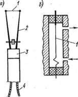 . Поскольку коэффициент теплоотдачи является функцией скорости = f(υ), то из приведенного уравнения следует, что в режиме заданного тока I = const температура нити = f(υ), является функцией скорости, а в режиме заданной температуры = const требуемое изменение тока ΔI будет функцией скорости ΔI = (υ). В датчике, показанном на рис. 3, а, нить выполнена из платиновой проволоки (диаметр 5—20 мкм, длина 2—10 мм), сопротивление которой меняется с температурой, и припаяна к двум манганиновым стерженькам 2. Сквозь ручку 3 пропущены выводы 4 для включения датчика в измерительную цепь.
