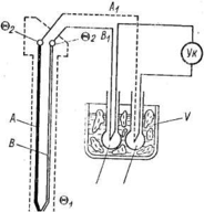 Удлинительные термоэлектроды. Свободные концы термопары должны находиться при постоянной температуре (рис. 7). Однако не всегда возможно сделать термоэлектроды термопары настолько длинными и гибкими, чтобы ее свободные концы размещались в достаточном удалении от рабочего спая. Кроме того, при использовании благородных металлов делать длинные термоэлектроды экономически невыгодно, поэтому приходится применять провода из другого материала. Соединительные провода А1 и В1 (рис. 7), идущие от зажимов в головке термопары до сосуда объемом V, тем пературу в котором желательно поддерживать постоянной, называют удлинительными термоэлектродами. Далее для соединения с измерительным прибором можно использовать обычные провода.