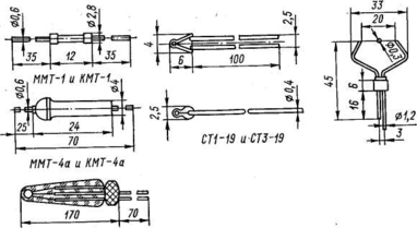 Конструктивно терморезисторы могут быть изготовлены самой разнообразной формы. На рис. 12 показано устройство нескольких типов терморезисторов. Терморезисторы типа ММТ-1 и КМТ-1 представляют собой полупроводниковый стержень, покрытый эмалевой краской, с контактными колпачками и выводами. Этот тип терморезисторов может быть использован лишь в сухих помещениях.