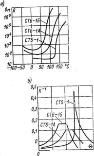 В зависимости от материала проводимость в критической области температур может как уменьшаться, так и увеличиваться. Так, серия резисторов типа СТ6, разработанных на базе титаната бария ВаТЮ3, имеет высокие положительные ТКС в области температур 65—150 °С. Полупроводниковые резисторы с положительными ТКС получили название позисторов. Температурные зависимости сопротивления некоторых типов позисторов показаны на рис. 17, а.