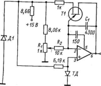 На рис. 16 представлена схема преобразователя температуры в частоту с диодом ТД типа Д9 в качестве термочувствительного элемента. Диод; ТД подключен к иеинвертирующему входу операционного усилителя, выполняющему функцию интегратора. На инвертирующий вход этого усилителя подается напряжение с делителя R1. Делитель и термодиод питаются стабильным током (Iтд = 1 мА) от источника опорного напряжения, задаваемого диодом Д1. Интегратор сбрасывается через транзистор Т1, когда конденсатор С1 заряжается до напряжения 10 В. Время заряда конденсатора и, следовательно, частота импульсов на выходе интегратора зависят 6т температуры, так как с увеличением температуры уменьшается напряжение на диоде ТД и увеличивается разность напряжений на входах усилителя. Регулировка чувствительности (S = 10 Гц/К) осуществляется изменением сопротивления R2, регулировка нуля — изменением сопротивления R1. Диапазон измерений преобразователя 0—100 °С, погрешность не превышает ±0,3 °С.