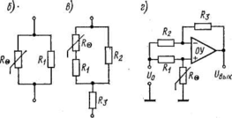 Для линеаризации при работе с полупроводниковыми терморезисторами можно использовать также нелинейную зависимость напряжения от одного из сопротивлений в резистивном делителе или неравновесном мосте. На рис. 15, г показана цепь подобного рода, содержащая операционный усилитель ОУ. В этой цепи напряжение с делителя R1 R подается на неинвертирующий вход усилителя ОУ
