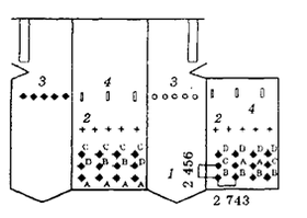 1 — малотоксичные горелки с указанием мельницы, oт которой подается угольная пыль (А, В, С и D),2-горелки - инжекторы для переизмельченной угольной пыли, 3 — сопла третичного воздуха; 4 - шлицы для регулирования температуры
