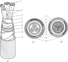 На рис. 1 показаний трижильний кабель з секторними жилами на напругу 10 кВ. Кожна жила ізольована від іншої спеціальної кабельної папером 2, просоченої спеціальної масою, до складу якої входять масло і каніфоль. Всі жили від землі ізольовані поясною ізоляцією 4 також з просоченої паперу. Для забезпечення герметичності кабелю на поясниу ізоляцію накладають свинцеву оболонку без швів. Від механічних ушкоджень кабель захищений бронею 8 з сталевої стрічки, а від хімічних впливів - асфальтованих джутом.