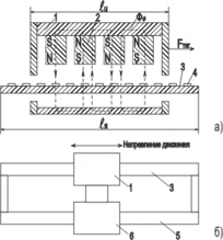 На рис.5, а показана схема электромагнитной системы линейного бесконтактного двигателя. Корпус индуктора 1 выполнен из ферромагнитного материала и служит внешним магнитопроводом. В корпусе расположены постоянные магниты 2, создающие поток возбуждения Фв, индуктор является подвижной частью линейного двигателя. Якорь 3 представляет собой диэлектрическую пластину, на поверхности которой методом фотолитографии выполнена печатная схема проводников 4. Якорь является неподвижной частью двигателя. Длина якоря lя больше длины индуктора lи на длину хода индуктора. Проводники якоря объединены в катушки, оси которых сдвинуты по длине якоря. Выводы катушек подсоединены к полупроводниковому коммутатору. На рис. 5, б показана схема кинематического звена поступательного перемещения с линейным двигателем. Якорь 3 прикреплен к неподвижной направляющей 5, а индуктор 1 – к подвижной каретке 6. На направляющей по осям катушек якоря расположены сигнальные элементы, вызывающие срабатывание датчиков положения индуктора относительно якоря, расположенных на каретке.