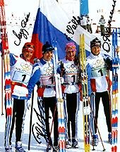 | Российские лыжницы - победители в эстафете 4х10 км. на олимпиаде в Нагано: Л. Лазутина, Н. Гаврылюк, Е. Вяльбе, О. Данилова. |