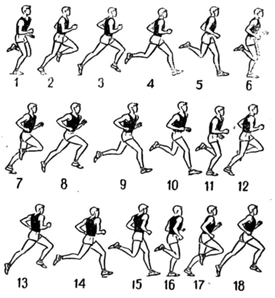 До момента вертикали (последующие кадры), мышцы бегуна, растягиваясь и напрягаясь, подготавливаются к сокращению в фазе отталкивания. Внешним признаком хорошего и эффективного отталкивания от грунта является полное и законченное выпрямление толчковой ноги во всех суставах в сочетании с активным выносом вперед – вверх бедра маховой ноги, что существенно усиливает мощность толчка. Задний толчок выполняется очень эффективно (3, 8, 13, 18), угол отталкивания равен примерно 50 градусам. В момент окончания заднего толчка голова должна держаться прямо, взгляд направлен вперёд.