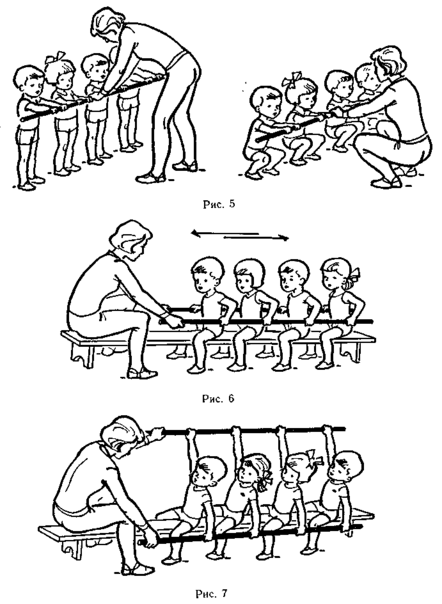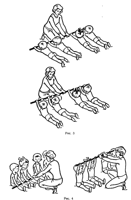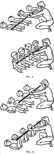однимает палку, дети подтягиваются к ней и садятся; по сигналу «ляжем» палку медленно опускает, дети возвращаются в исходное положение (рис. 1).