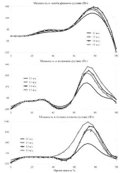 Рис. 4. Мощности разгибания в суставах толчковой ноги при разной скорости бега