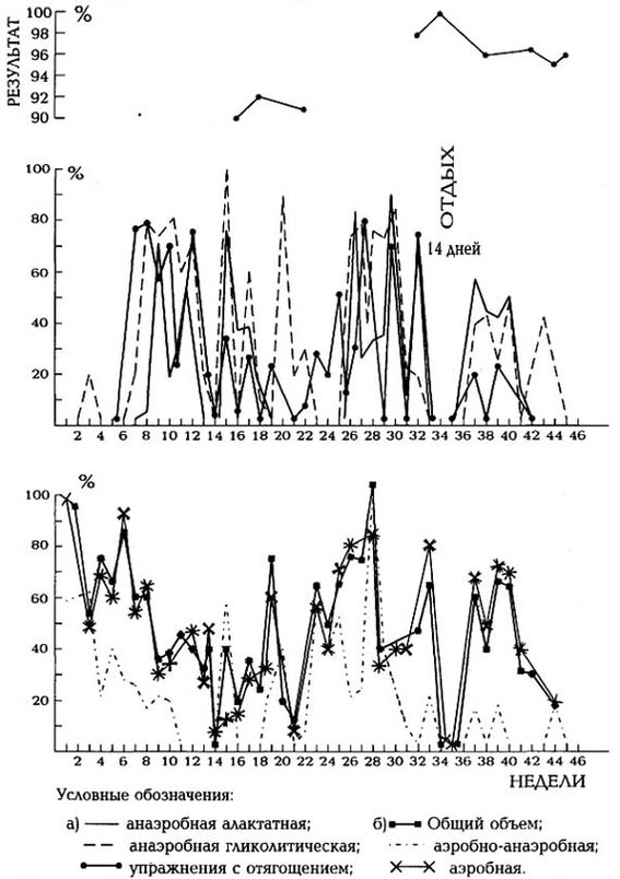 Рис. 8. Динамика тренировочных нагрузок и спортивного результата в годичном цикле подготовки у спортсменки Б. (мс, л/атл., бег 400 м)