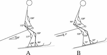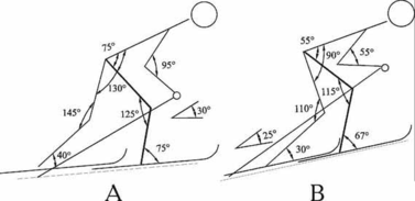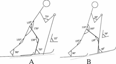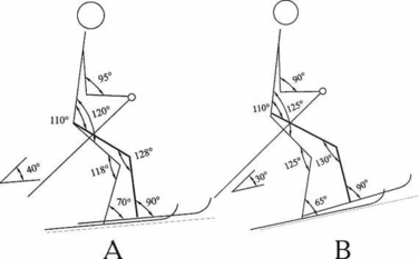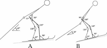 Маховым движением правая нога подносится к левой, что сопровождается одновременным подседанием на обеих ногах. Чем круче подъем, тем глубже подседание. Это видно по изменившимся в коленном суставе углам к началу второй фазы цикла (рис. 2). На пологом подъеме маховое движение сопровождается уменьшением угла на 10о, а на крутом - на 45о. С ускорением выполняется маховое движение , а затем - резкое торможение и остановка правой ноги перед левой на расстоянии стопы.