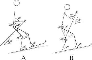 Первая фаза - скольжение на левой лыже с отталкиванием руками (рис. 1). Левая нога согнута в коленном суставе под углом 130о, который практически не зависит от крутизны подъема. Руки согнуты под углом 60-70о. Правая нога слегка согнута в коленном суставе под углом 155о, отведена назад и находится на одной прямой с корпусом (подготовлена к маховому движению вперед).