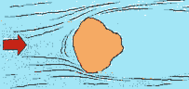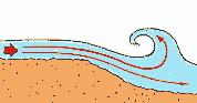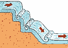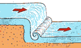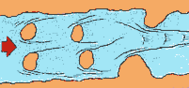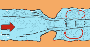 | | Поток воды, образующийся в центре узости, называется "ЯЗЫК". По сторонам языка образуются зоны обратного тока воды (красные стрелки) называемые "СБОЙКА" |