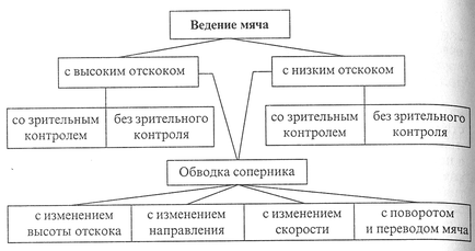 Ведение мяча - прием (классификация ведения мяча представлена на рис.10), дающий возможность игроку двигаться с мячом по площадке с большим диапазоном скоростей и в любом направлении.