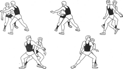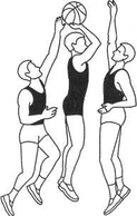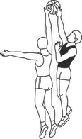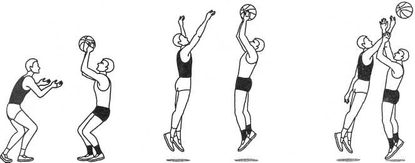 выпрыгивая для овладения мячом. Прыжок выполняется как одной, так и двумя ногами после небольшого разбега или с места. Высоко выпрыгнув и завладев мячом, игрок при приземлении широко разводит ноги и сгибает туловище, чтобы в силовой борьбе помешать сопернику занять выгодное положение по отношению к щиту и мячу (рис. 22).