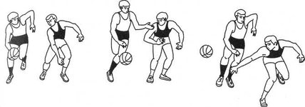 Выбивание мяча при ведении. В момент начала прохода нападающего с ведением защитник отступает и слегка отпрыгивает назад, оставив сопернику прямой путь к корзине, и преследует его, оттесняя к боковой линии. Затем защитник набирает такую же скорость, как и нападающий, и, опередив ритм ведения, выбивает мяч ближайшей к сопернику рукой в момент приема мяча, отскочившего от площадки (рис. 17).