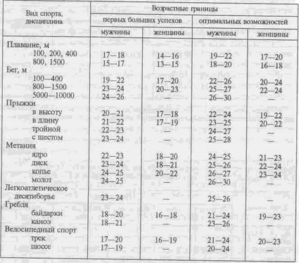 Планирование многолетней подготовки спортсменов высокого класса связано с научнообоснованным установлением оптимальных возрастных границ, в которых обычно демонстрируются наивысшие спортивные результаты. Во многих видах спорта периоды «первых больших успехов» или «оптимальных возможностей» достижений наивысших спортивных результатов совпадают или с периодом обучения будущего специалиста, или со временем начала профессиональной деятельности после окончания высшего учебного заведения.