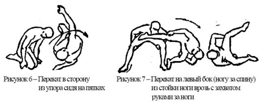 б) из упора сидя на пятках, перекат в сторону с последовательным касанием мата левым предплечьем, плечом, левым боком, спиной и правым боком (рис. 6). Опираясь руками, возвратиться в исходное положение. В перекате стараться сохранить исходное положение;