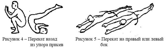 Перекат назад из упора присев (на всей ступне). Сгруппироваться и, падая назад, мягко перекатиться, последовательно касаясь, пола различными частями тела. Закончить перекат касанием мата шеей и затылком (рис. 4). Движением вперед возвратиться в исходное положение.
