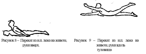 а) лежа на животе, руки вверху, прогнуться в грудной и поясничной частях тела, перекатиться на грудь, оттолкнуться руками и перекатиться до касания бедрами. То же, лежа на животе, тело прогнуто, руки вверх (рис. 8). То же, но руки вдоль тела (рис. 9);