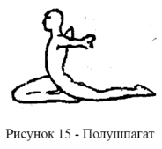 Полушпагат (рис. 15). Подготовительными упражнениями могут служить взмахи ногами вперед, назад и в сторону у гимнастической стенки или другие упражнения на растягивание мышц задней поверхности бедра.