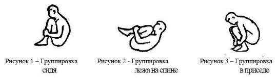Группировка сидя. Сидя на полу, согнуть ноги в коленных и тазобедренных суставах, взяться руками за середину голеней, притянуть ноги к груди, голову наклонить вперед. Колени слегка развести в стороны, чтобы плотнее сгруппироваться и предохранить лицо от ударов о колени (рис. 1).