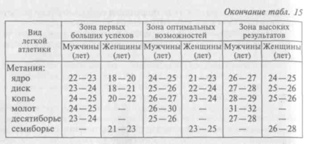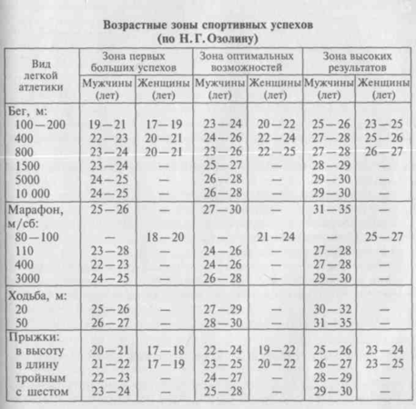 Оптимальные возрастные границы для наивысших достижений в большинстве видов легкой атлетики достаточно стабильны, на них не оказывает серьезного влияния ни система отбора и тренировок, ни время начала занятий, ни другие факторы. Зная возраст ученика и пользуясь данными таблицы, можно определить то количество лет, которое он может затратить на пути к мастерству. Обычно путь от новичка до мастера спорта международного класса занимает 8-10 лет. При этом надо учитывать, что в зависимости от индивидуальных особенностей спортсмена, условий его жизни и режима тренировок могут быть и некоторые отклонения от представленных в таблице возрастных зон. У женщин путь к достижению высокого спортивного мастерства обычно короче, чем у мужчин. Спринтеры и прыгуны проходят более короткий путь подготовки к вершинам мастерства, чем стайеры и ходоки. Способные спортсмены достигают первых больших успехов в большинстве случаев через 4 - 6 лет после начала занятий.