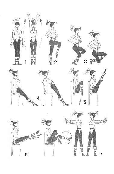 Сидя на стуле, согнуть колени, выпрямить ноги и выполнить движение "ножницы" максимально возможное число раз. После этого, немного передохнув, выполнить упражнение "велосипед" до лёгкого утомления.