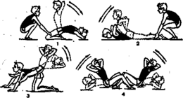 И. п. — сидя лицом друг к другу, руки за головой, полусогнутые ноги одного зажаты между полусогнутыми ногами другого. Одновременные наклоны назад возможно ниже и возвращение в и. п. (вариант упражнения: наклонившись назад, повороты туловищем налево и направо) (см. рис. 2, 4).
