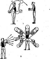 И. п. — стоя ноги врозь, лицом друг к другу. Первый выполняет серию бросков в строго заданные точки пространства около партнера, второй ловит мяч, не отрывая ног от пола, и возвращает его первому. Затем партнеры меняются ролями (см. рис. 3, 2),