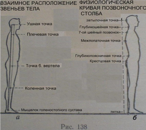 При прямой осанке (рис. 139, а) все звенья тела располагаются наиболее выгодном положении для удержания их в равновесии. Голова поставлена прямо, туловище выпрямлено с развернутым плечевым поясом, живот подтянут, ноги разогнуты в коленных и тазобедренных суставах и стоят вертикально. Позвоночник имеет углубления и возвышения примерно одинаковой величины.